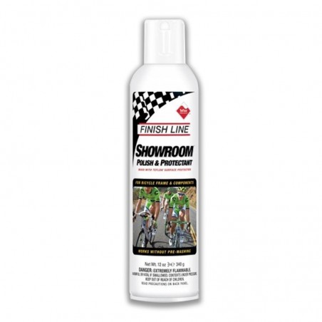 El Finish Line Showroom™ Polish & Protectant es un producto de limpieza y protección para bicicletas que combina agentes abrillantadores con Teflón™, formando una capa repelente al agua y la suciedad. Su fórmula patentada permite aplicarlo directamente sin necesidad de lavado previo. Basta con rociar, dejar actuar 10 segundos y limpiar con un paño seco.
