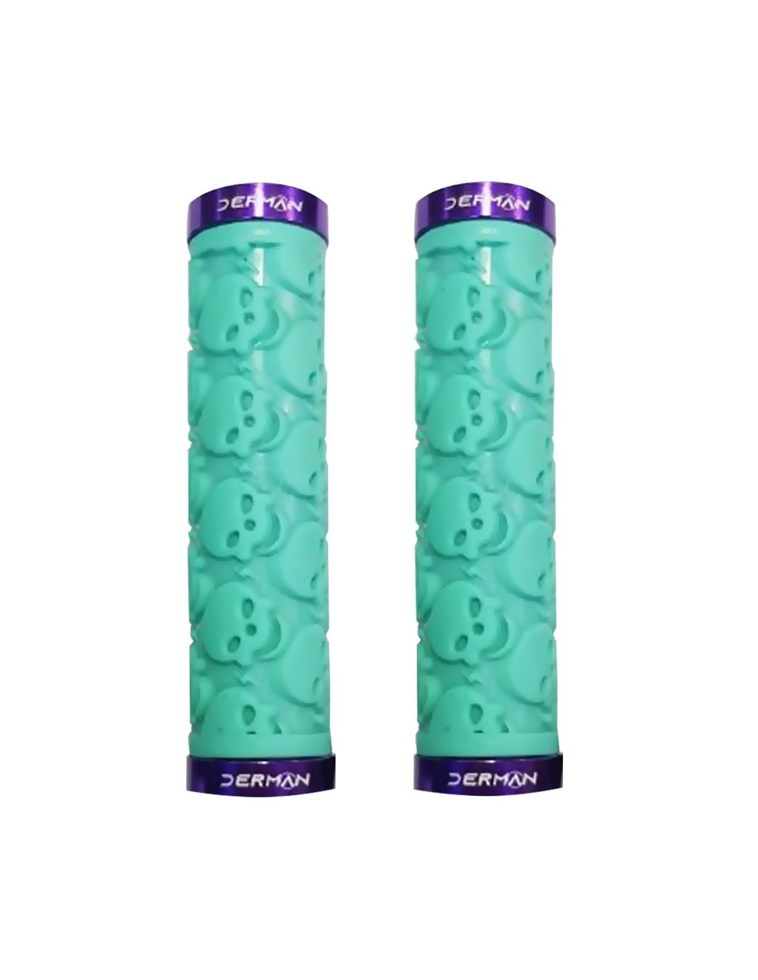 Puños Derman con diseño calavera y sistema de fijación apernado, disponibles en colores rosado, morado y celeste. Fabricados en goma antideslizante, ofrecen comodidad y estilo para ciclistas que buscan personalizar su bicicleta.