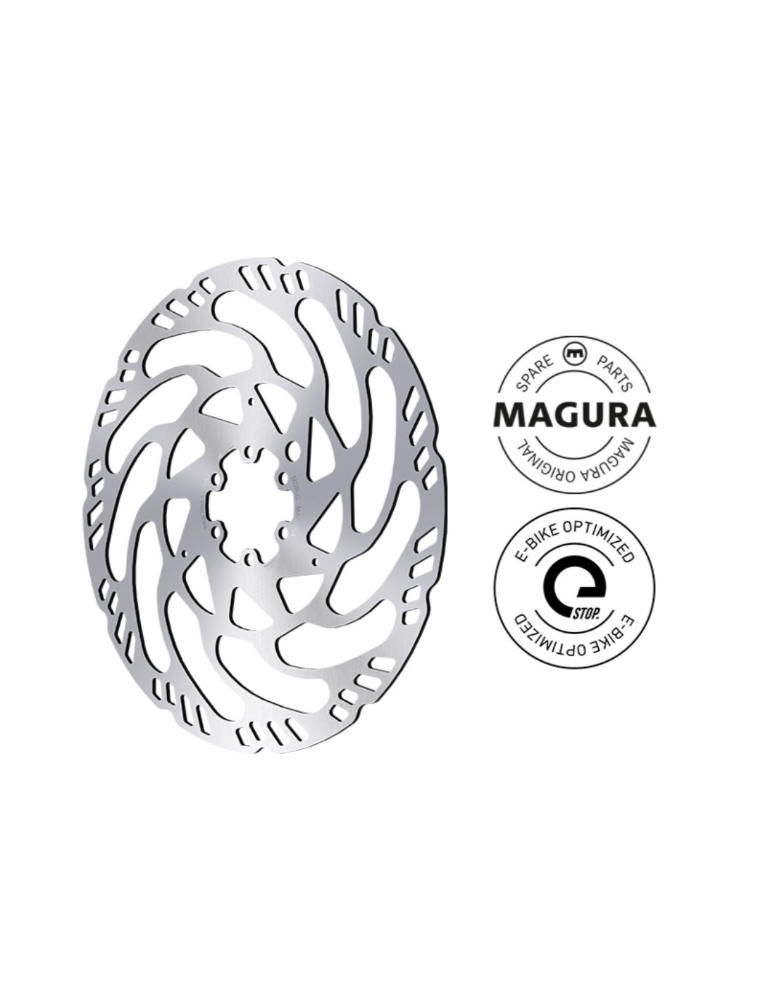 El Magura MDR‑C eSTOP 203 mm es un disco de freno diseñado para bicicletas eléctricas (E‑Bikes/E‑MTB) y MTB de alto rendimiento. Su diámetro de 203 mm proporciona potencia de frenado superior y estabilidad en descensos prolongados, mientras que la tecnología MDR‑C eSTOP asegura mayor rigidez, resistencia a la torsión y reducción de vibraciones, optimizado para el peso y potencia adicionales de las E‑Bikes.