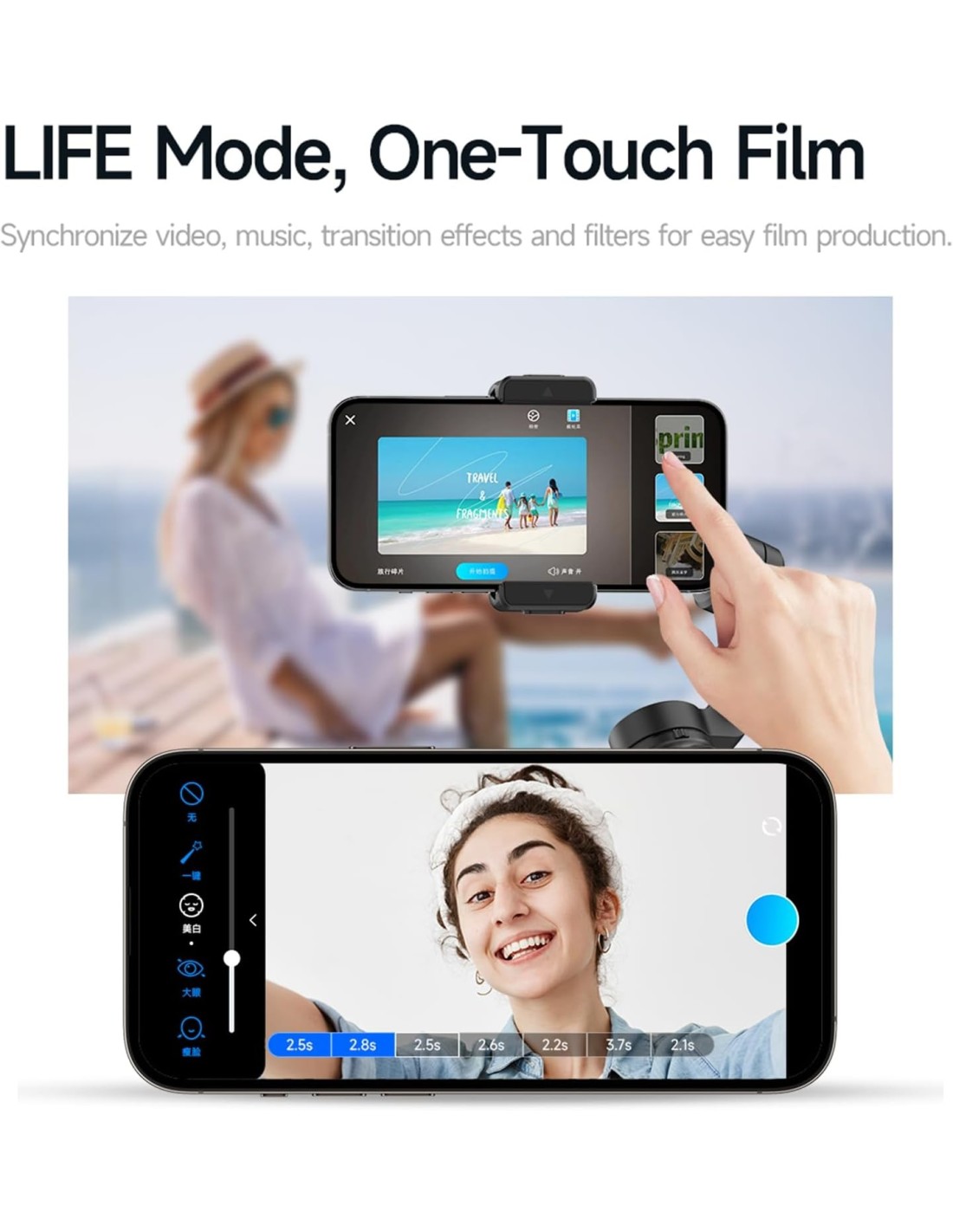Este estabilizador cuenta con un sistema avanzado de estabilización para imágenes suaves, un puerto de expansión de orificio de tornillo estándar de 1/4" para accesorios, y es compatible con teléfonos de hasta 280 gramos, un ancho de 1.96-3.54 pulgadas y grosor ≤0.43 pulgadas.
