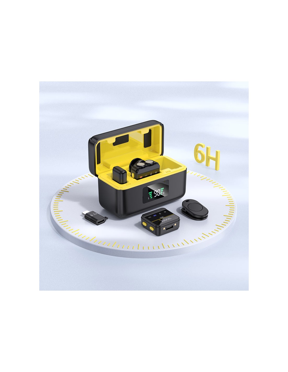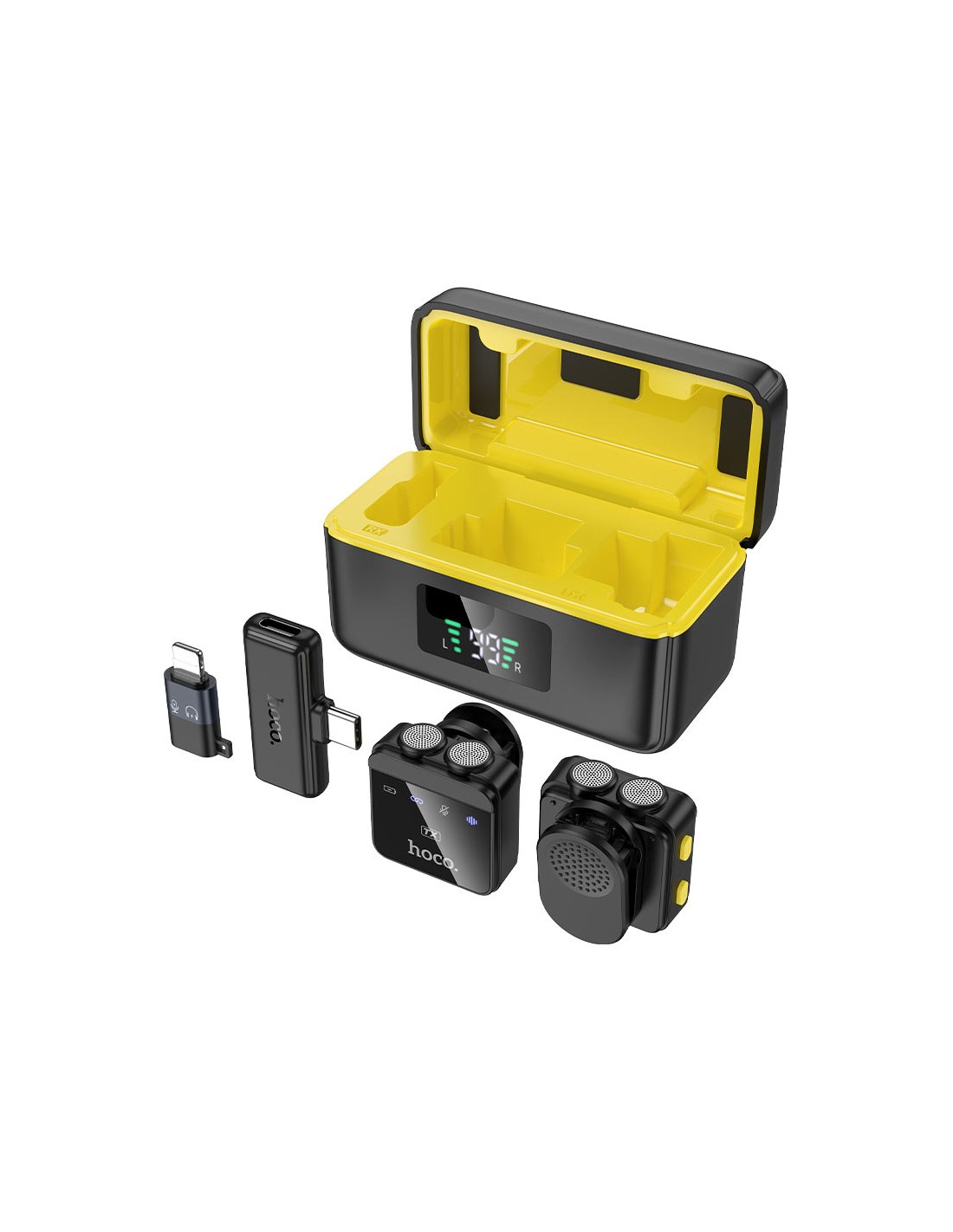 Micrófonos digitales inalámbricos con estuche de carga, solapa magnética, receptor tipo C y adaptador iP.