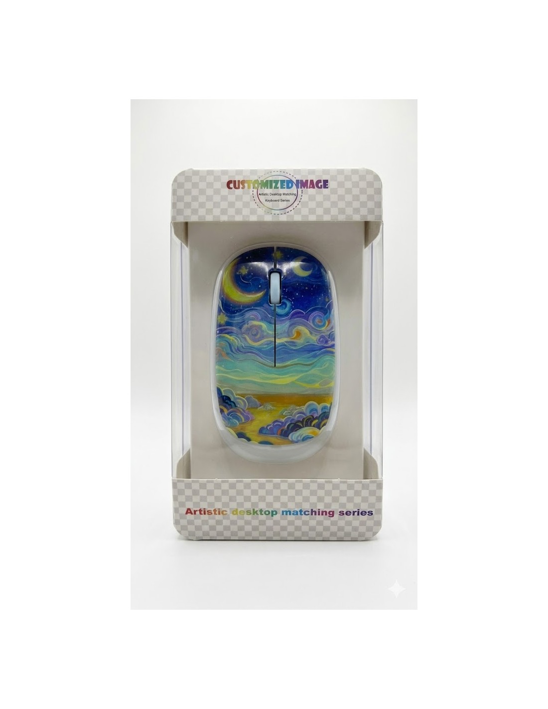 🌙 MOUSE INALÁMBRICO EDICIÓN NOCHE ESTRELLADA Lleva la magia del universo a la palma de tu mano. Este mouse no es solo un periférico, es una declaración de estilo para quienes encuentran inspiración en el cielo nocturno y el arte.