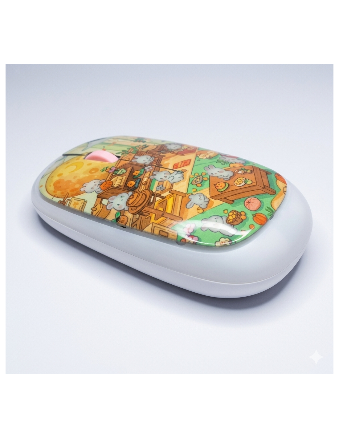 ✨ ILUMINACIÓN LED INTEGRADA El mouse cuenta con una luz suave que recorre sus bordes y resalta la ilustración, creando un ambiente acogedor.
